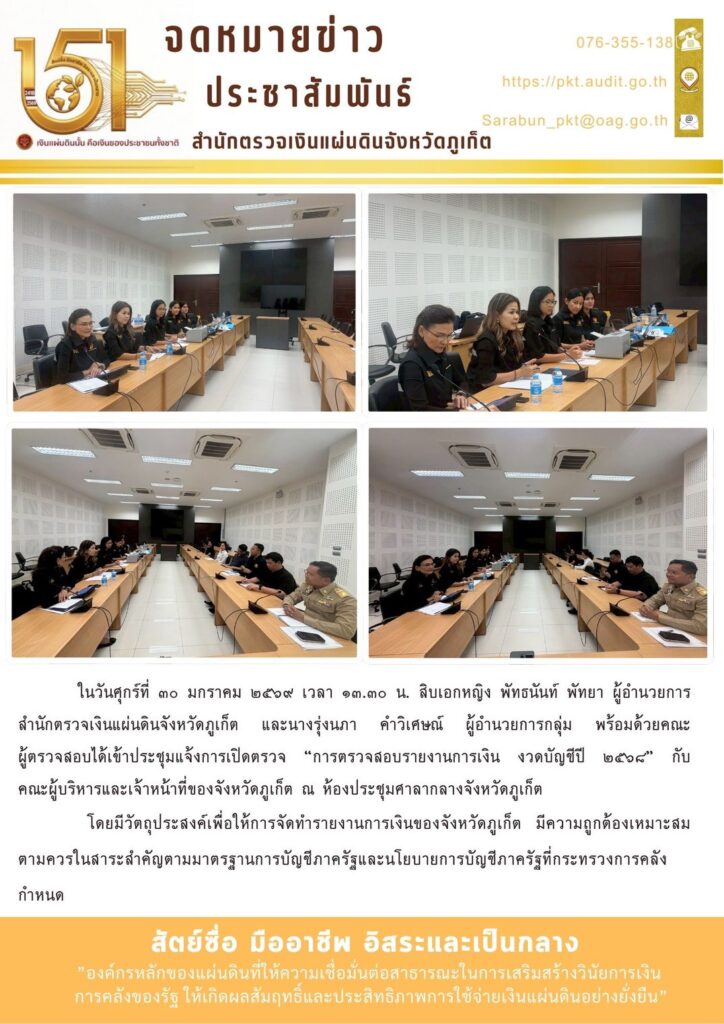 ประชุมเปิดตรวจ การตรวจสอบรายงานการเงิน ของ จังหวัดภูเก็ต สำหรับงวดบัญชี ปี ๒๕๖๘กิจกรรมตรวจสอบ, กิจกรรมประชาสัมพันธ์, ภาพกิจกรรมกุมภาพันธ์ 6, 2026 Post Views: 52