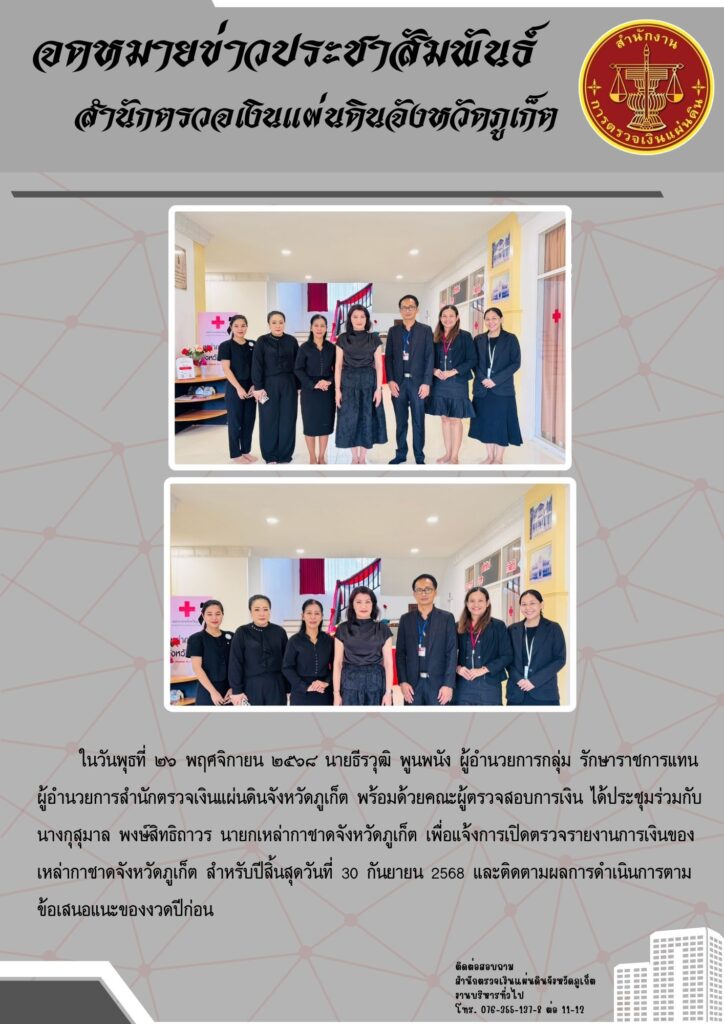 เปิดตรวจรายงานการเงินของ เหล่ากาชาดจังหวัดภูเก็ต สำหรับปีสิ้นสุดวันที่ ๓๐ กันยายน ๒๕๖๘กิจกรรมตรวจสอบธันวาคม 18, 2025ธันวาคม 18, 2025 Post Views: 80