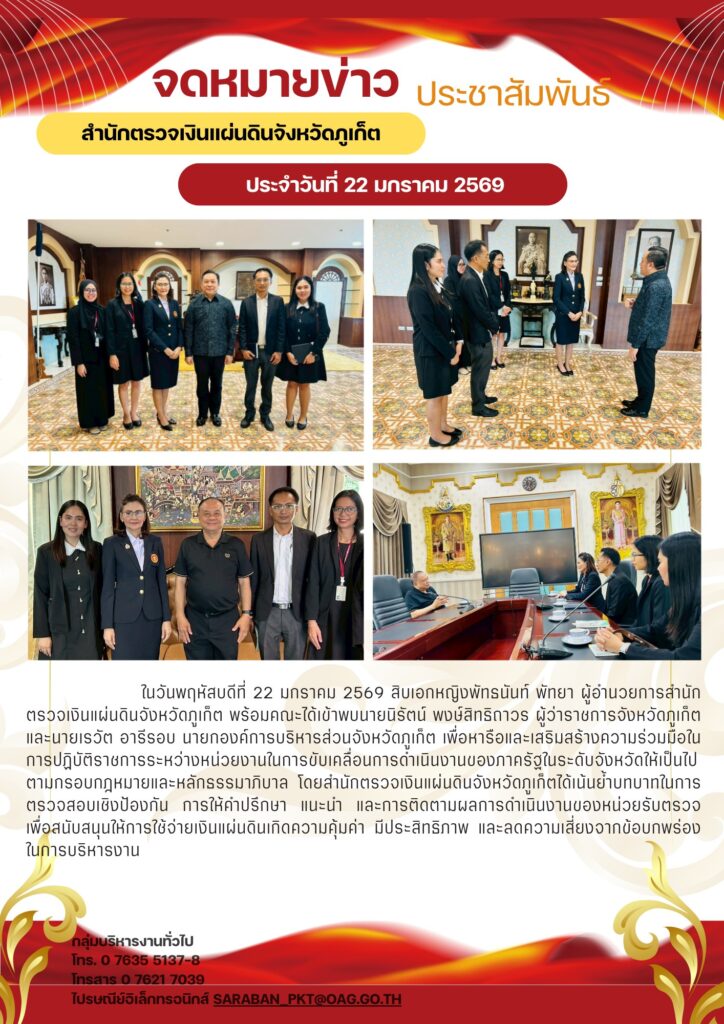 เข้าพบผู้ว่าราชการจังหวัดภูเก็ต และนายกองค์การบริหารส่วนจังหวัดภูเก็ต เพื่อหารือและเสริมสร้างความร่วมมือในการปฏิบัติราชการระหว่างหน่วยงานข่าวประชาสัมพันธ์มกราคม 28, 2026กุมภาพันธ์ 6, 2026 Post Views: 60